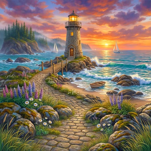 Shoreline View with Nautical Sails